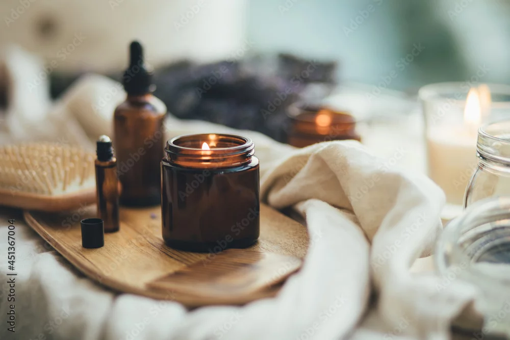 Fototapeta Natural organic oil and bottles with herbal cosmetics. Home spa and beauty rituals.