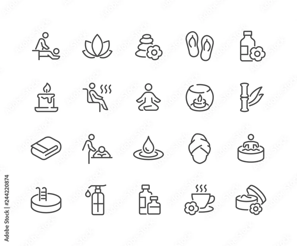 Fototapeta Prosty zestaw ikon związanych z spa wektor linii. Zawiera takie ikony, jak masaż, świeca, sauna i inne. Obrys edytowalny. 48 x 48 pikseli Perfect.