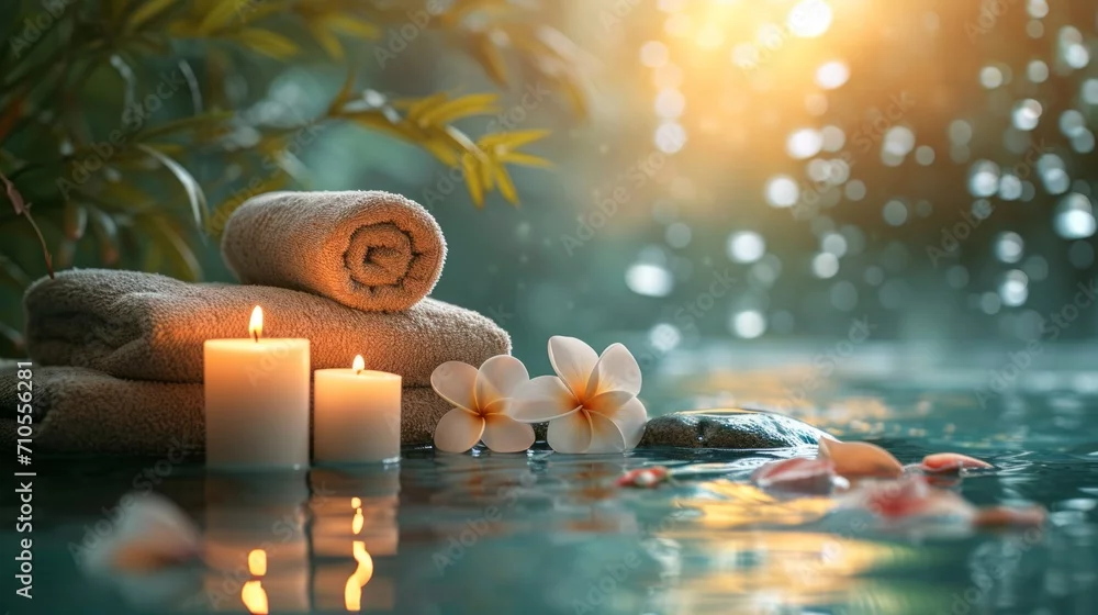 Fototapeta Spa treatments, massages, and calming spa environments supplies zen stones and water spa of deep relaxation and tranquility and with space for text concepts. spa background