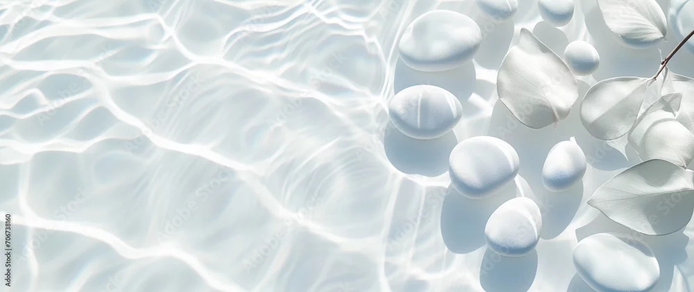 Transparent and clean white water and stones with sun shadow. abstract spa background concept banner for cosmetic body care. top view, beauty backdrop, mock up
