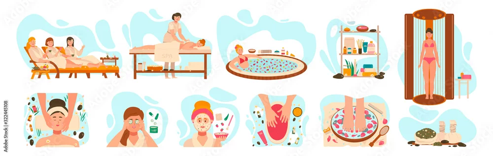 Women in spa center, wellness beauty salon procedures, vector illustration. Professional skin care and body treatment in spa salon, relaxing cosmetic procedures. Woman in luxury wellness center