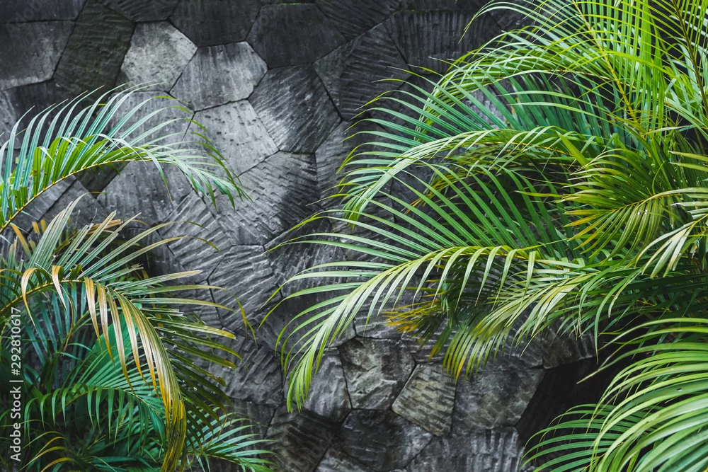 Fototapeta Ciemnoszary betonowej kamiennej ściany tło z zielonymi tropikalnymi palmowymi liśćmi. Tekstura dżungli z pustej przestrzeni