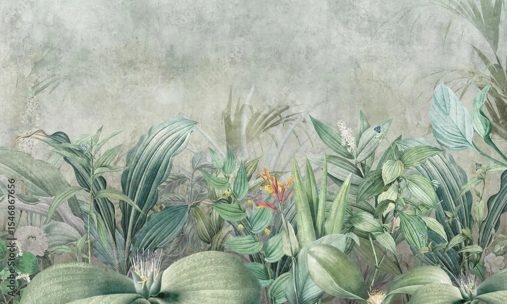 Fototapeta Mural Wallpaper. Tropical Flower Bushes Wallpaper Mural. Vintage Tropical Background