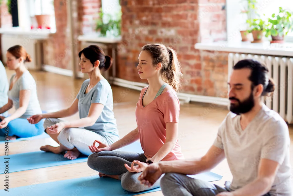 Fototapeta grupa ludzi wykonujących ćwiczenia jogi w studio