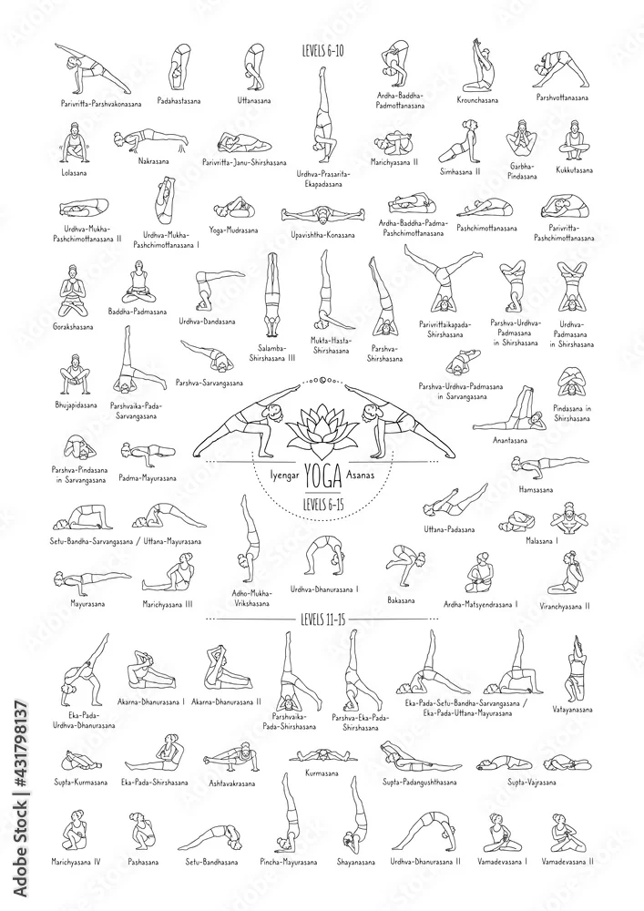 Fototapeta Hand drawn poster of hatha yoga poses and their names, Iyengar yoga asanas difficulty levels 6-15 - do szkoły jogi - Picturewall.pl