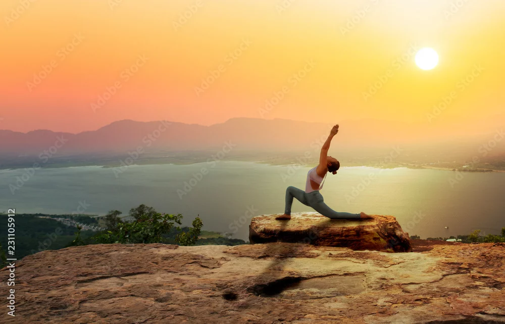 Fototapeta Kobiety praktyki joga na górze z zmierzchu lub wschodu słońca tłem