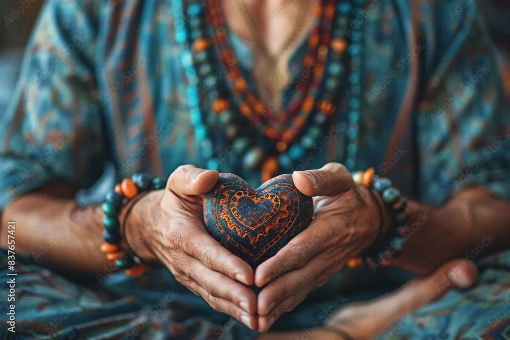 Fototapeta Meditation focused on compassion, self-care, and appreciation, with a man practicing yoga and placing his hand over his chest.
