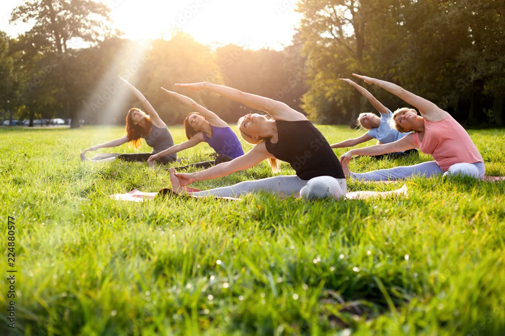 Fototapeta Mixed age group of people practicing yoga outside in the park while sunset