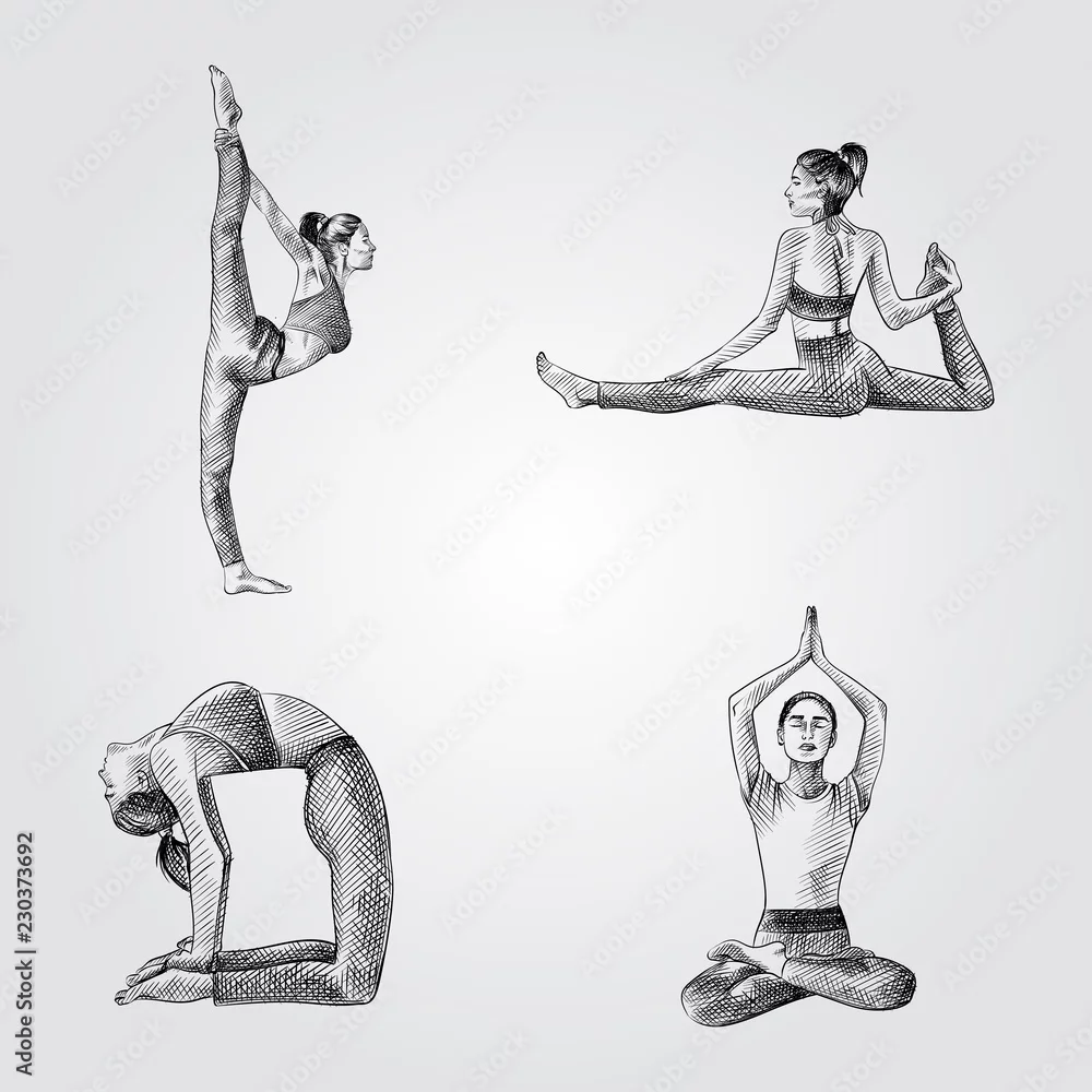 Set of Hand drawn woman practicing yoga poses. Vector illustration of yoga poses in sketch style isolated on white background. Asanas sketches