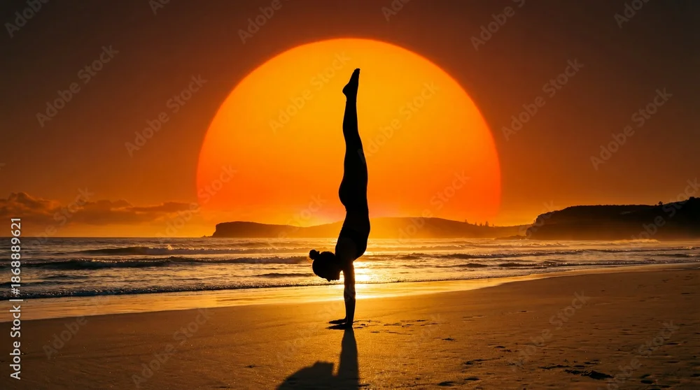 Fototapeta Yoga handstand silhouette at golden sunset beach. Wellness fitness exercise balance meditation mindfulness concept. Ocean waves peaceful seascape. Healthy lifestyle active workout training.