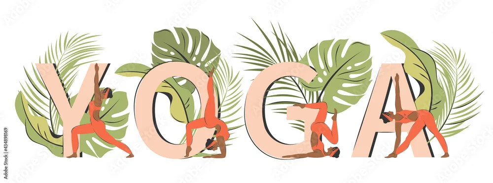 Yoga poses set near letters. African-american woman doing various yoga exercises and stretching. Character demonstrating various yoga positions. Vector illustration in a flat style