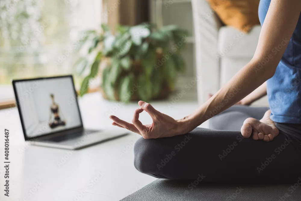 Young woman practicing yoga at home, online video training, Girl doing exercises and meditate, Yoga, balance, meditation, relaxation, healthy lifestyle, online training class concept