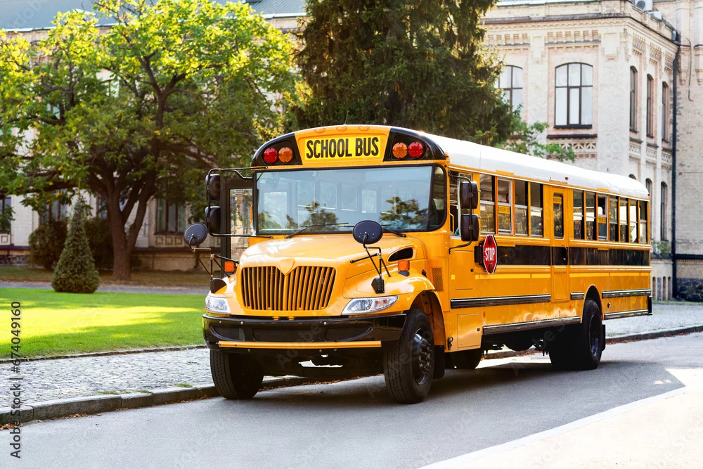 Fototapeta Classic yellow school bus with red stop sign standing on the road - do szkoły - Picturewall.pl