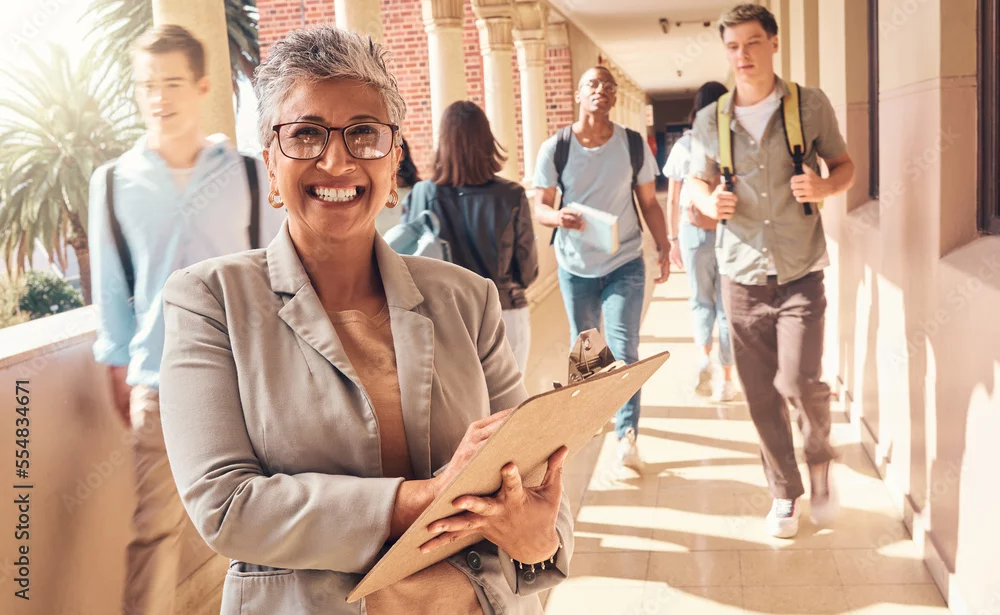 Education clipboard, students and portrait of teacher happy on college campus for coaching, teaching and learning. Knowledge study, high school principal or university professor with daily checklist