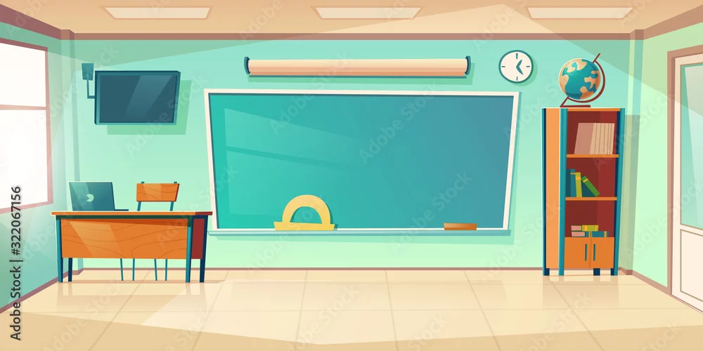 Empty classroom interior, school or college class with teacher table, laptop, green blackboard with protractor, clock hanging on wall and books cupboard, room for studying. Cartoon vector illustration