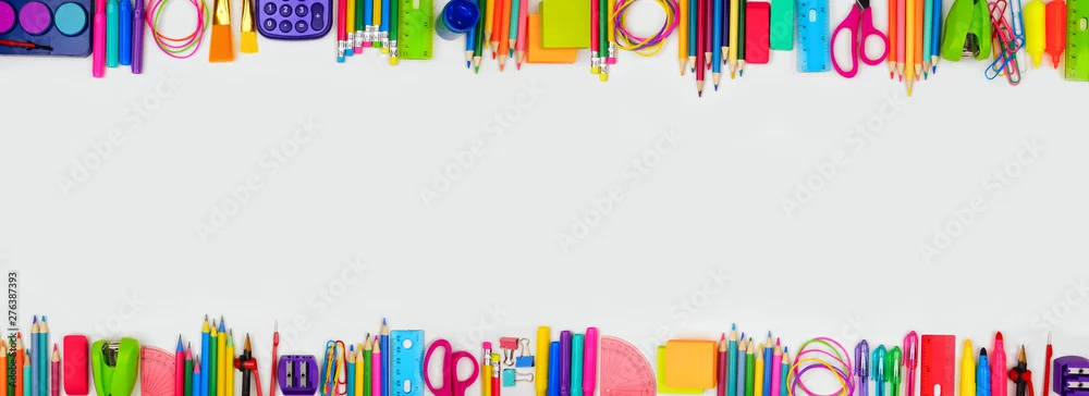 Fototapeta Przybory szkolne banner podwójnej granicy. Widok z góry na białym tle z miejsca kopiowania. Powrót do koncepcji szkoły. - do szkoły - Picturewall.pl