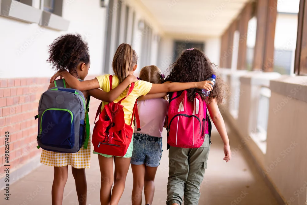 Fototapeta Rear view of multiracial elementary schoolgirls with backpacks and arm around walking in corridor - do szkoły - Picturewall.pl