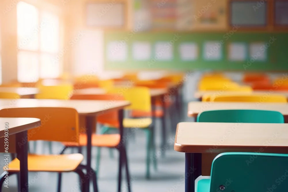 School classroom in blur background without young student. Blurry view of elementary class room no kid or teacher with chairs and tables in campus. Back to school concept