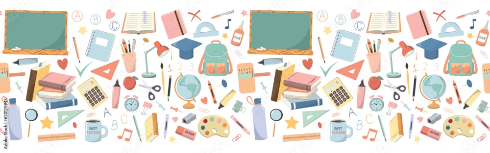 Fototapeta School education seamless border with cartoon school supplies, stationery. Back to school theme design. Isolated on white background. - do szkoły - Picturewall.pl