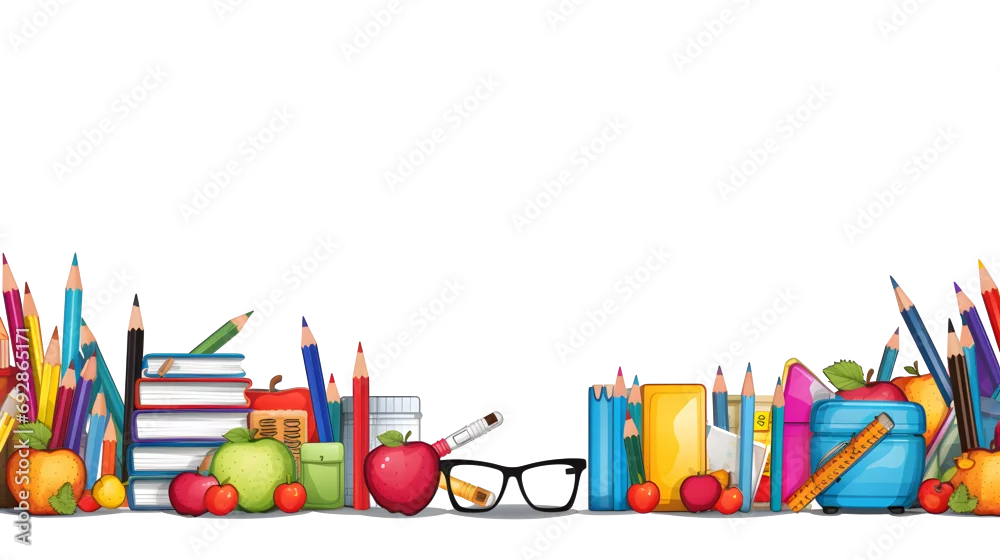 School education seamless border with cartoon school supplies, stationery. Back to school theme design. Isolated on white background. generative AI.