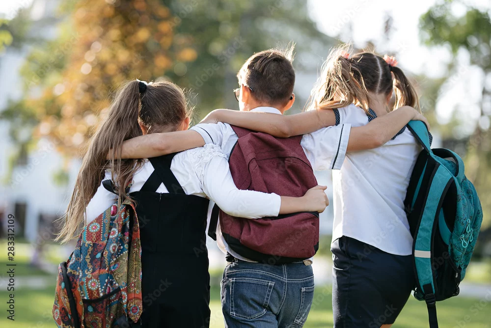 Fototapeta school friends a boy and two girls with school backpacks on their backs walk after class - do szkoły - Picturewall.pl