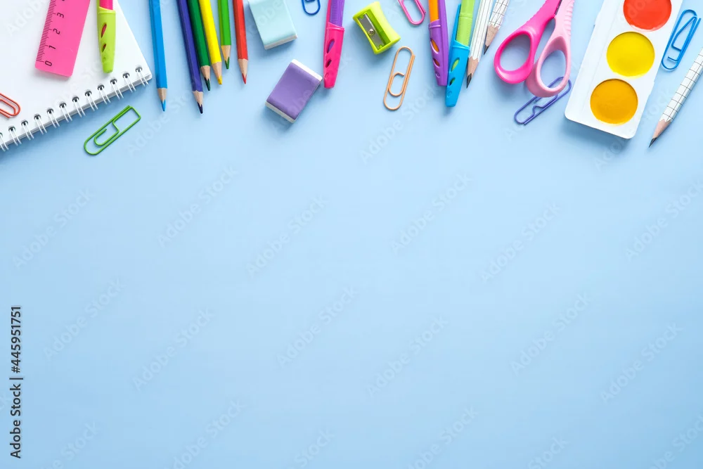 Fototapeta School stationery frame border top view. Back to school concept on blue background. Flat lay, view from above.