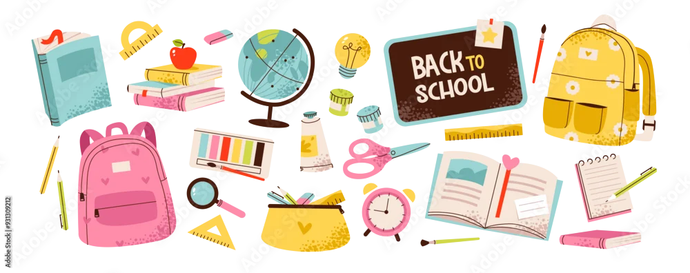 Fototapeta School supplies set. School and office set with books, pens and backpack and various stationery items. Flat vector illustration - do szkoły - Picturewall.pl