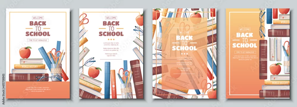 Fototapeta Set of flyer template with school accessories, books and textbooks. School time, back to school, education. Flyer, poster, banner size a 4. - do szkoły - Picturewall.pl