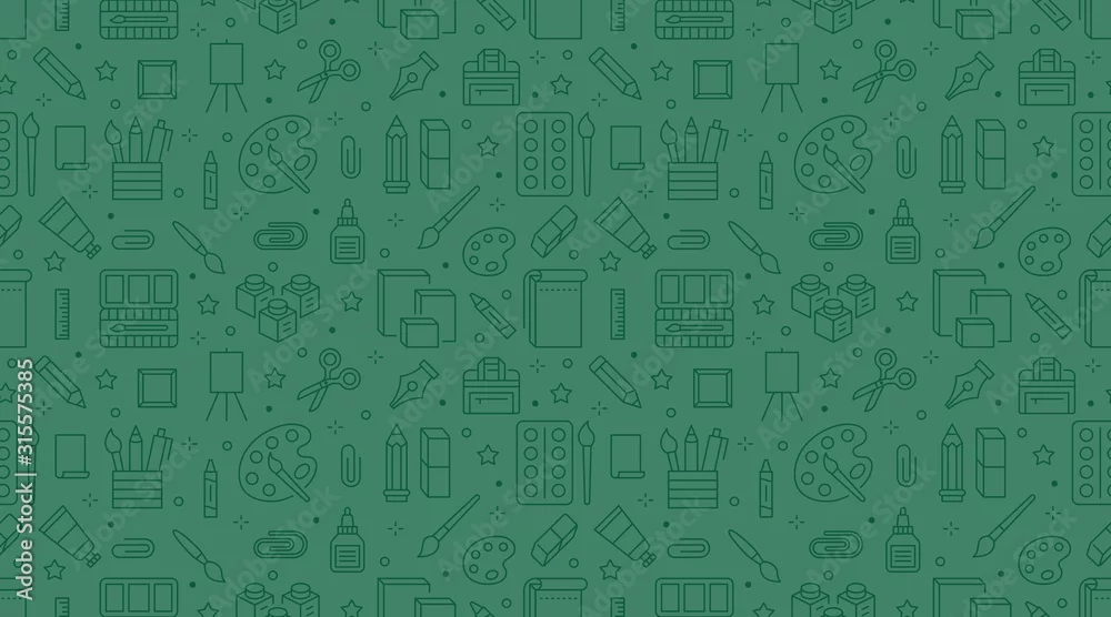 Fototapeta Stationery background, school tools seamless pattern. Art education wallpaper with line icons of pencil, pen, paintbrush, palette, notebook. Painter supplies vector illustration green color
