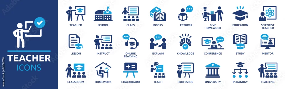 Fototapeta Teacher icon set. Containing lesson, class, school, teaching, mentor, professor, education, books, instruct, knowledge and pedagogy. Vector solid symbol collection. - do szkoły - Picturewall.pl