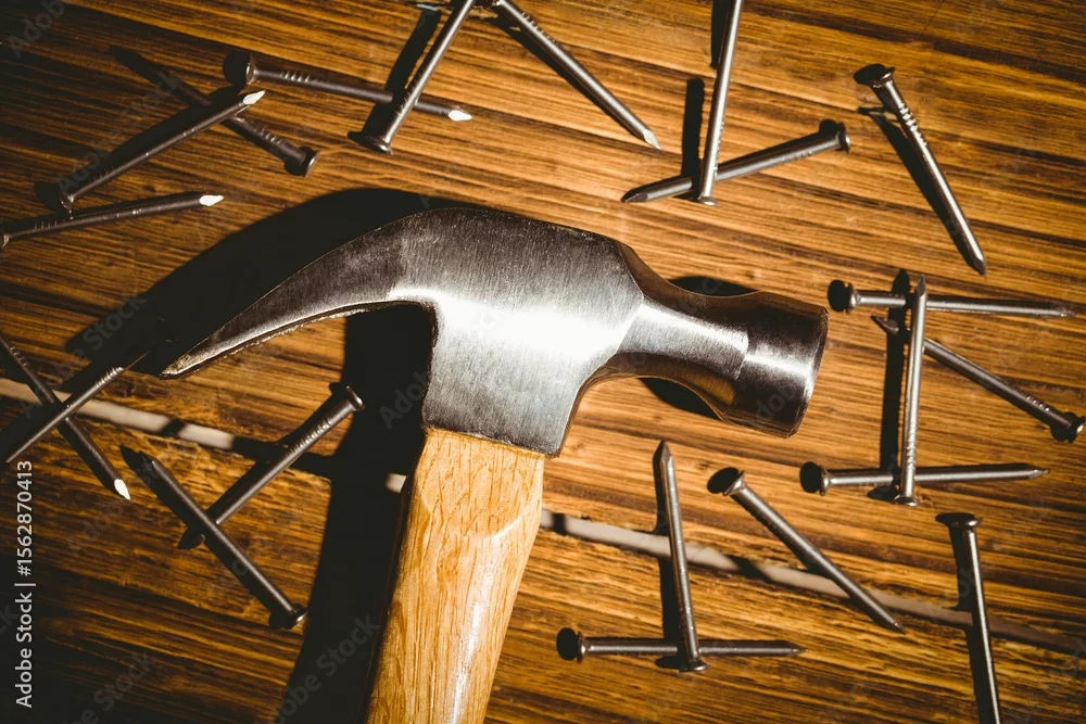 Fototapeta Claw hammer is lying flat on wood-grain work surface with scattered steel nails, flat design