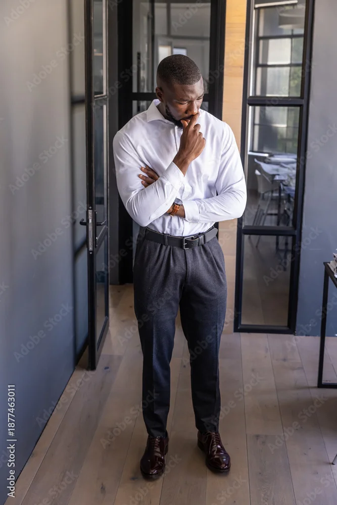 Fototapeta Corporate professional standing in office corridor, with black metal glass doors, wood floor