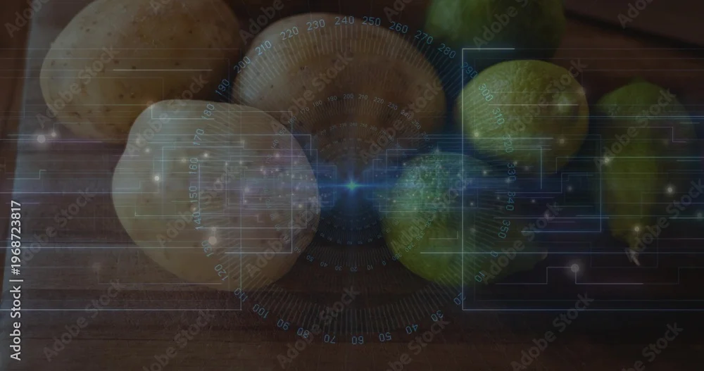 Fototapeta Displaying cluster of pale rounds and green pears resting on wooden cutting board, with HUD gauge