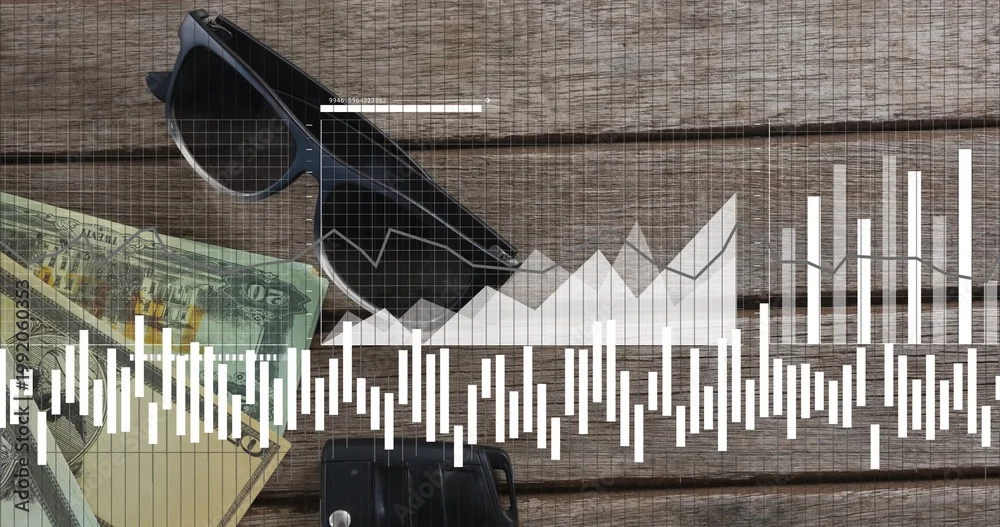 Fototapeta Displaying dark-framed sunglasses lying diagonally on wooden plank, with cash, car key and charts - drewno - Picturewall.pl