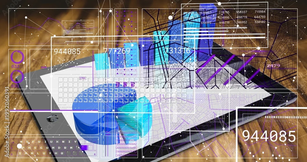 Fototapeta Displaying tablet computer showing map overlays, blue pie chart and virtual keyboard on wood desk