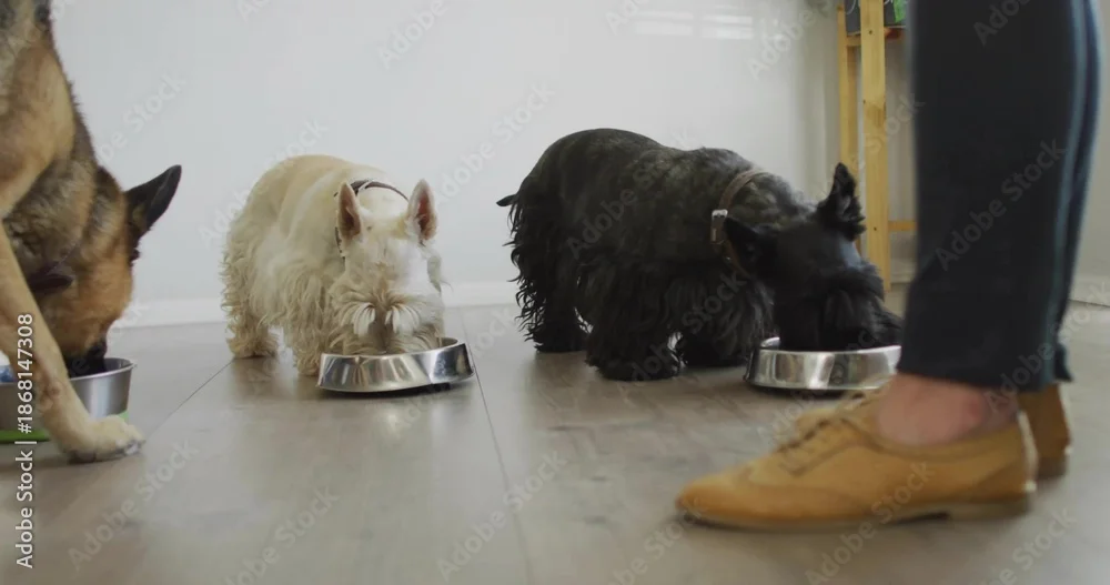 Fototapeta Eating three dogs feeding from stainless bowls on wood floor, showing collars and tan suede shoe