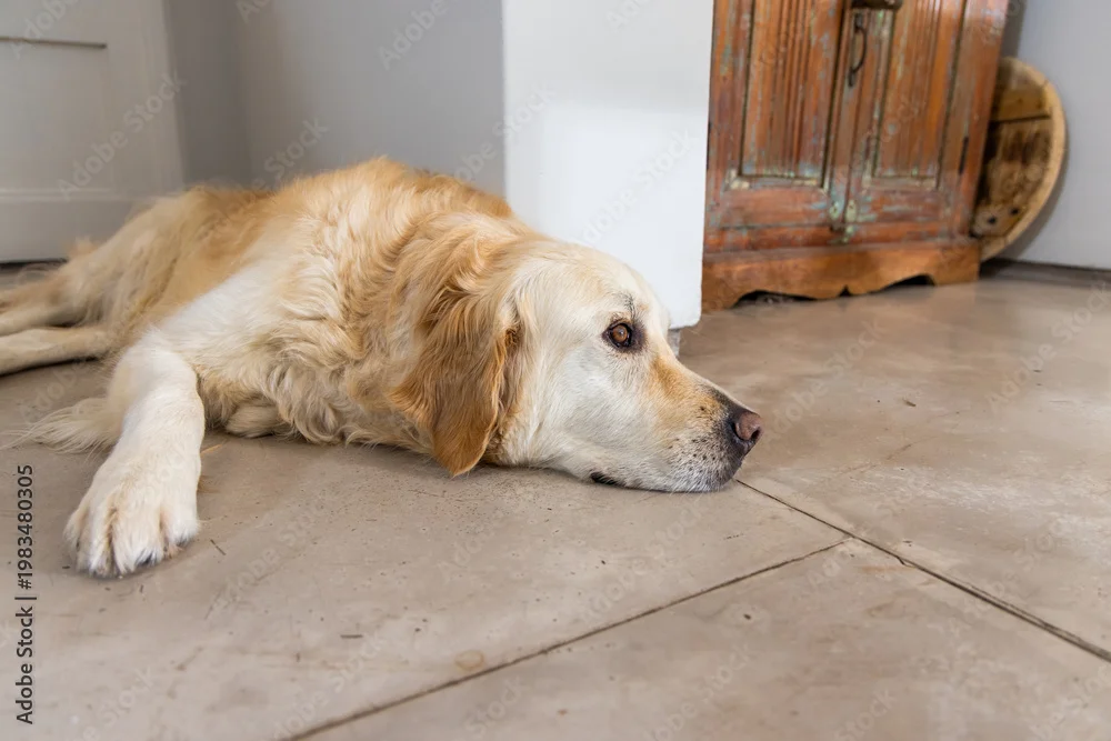 Fototapeta Golden retriever lying with head resting on tiled floor at home near rustic wooden cabinet