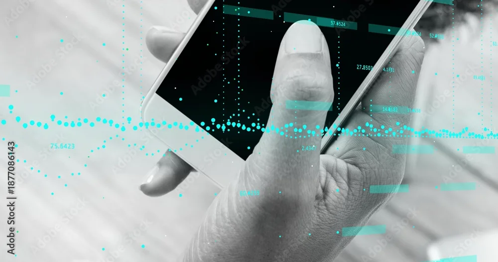 Fototapeta Holding right hand gripping white smartphone over light wood table, showing cyan data overlay