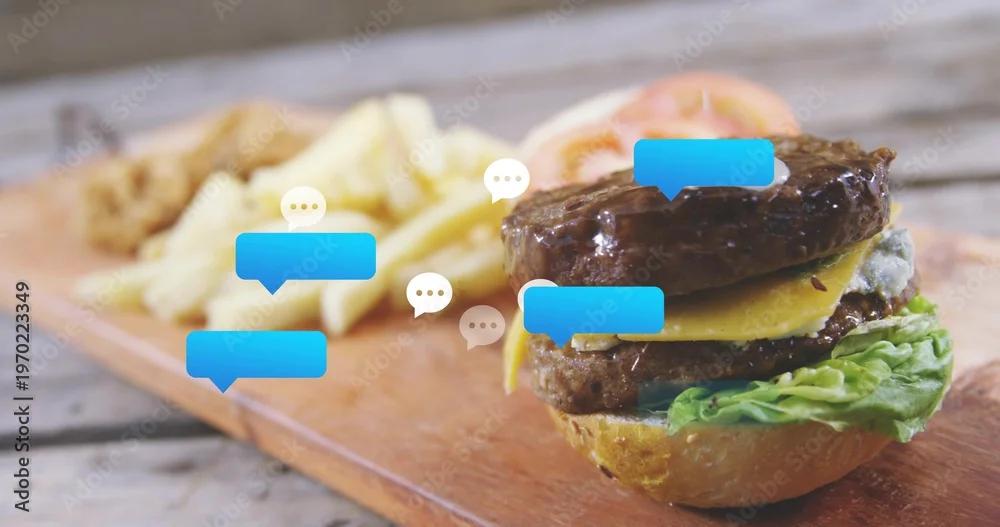 Fototapeta Showing double-cheeseburger on wood board at rustic table with fries and speech-bubbles, copy space