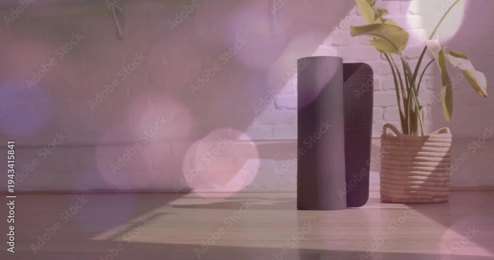 Fototapeta Standing dark rolled yoga mat beside basket planter holding leafy plant on wood floor, copy space