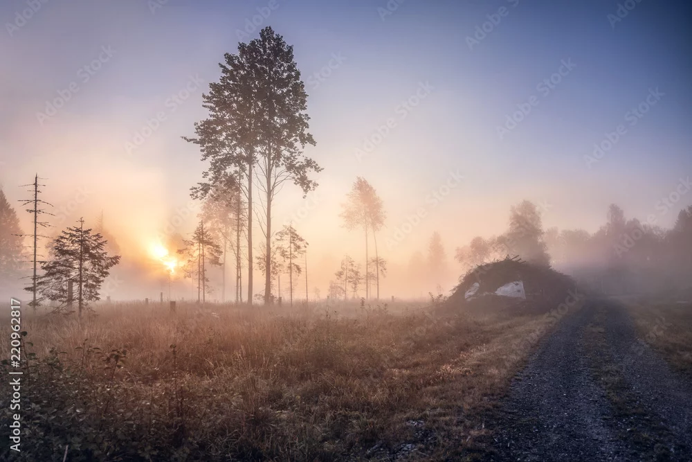 Fototapeta Mglisty poranek wschód słońca nad jeziorem