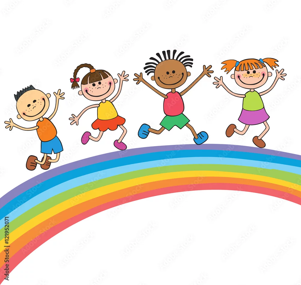 Fototapeta Dzieci skaczą z radości na wzgórzu pod tęczą, kolorowa kreskówka
