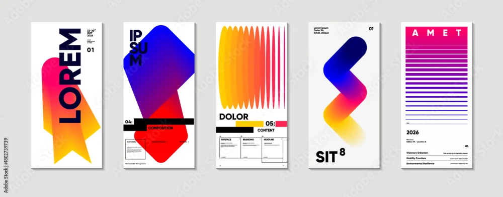 A collection of five modern, abstract poster designs featuring bold typography and vibrant gradients. Each poster showcases unique geometric shapes and color schemes