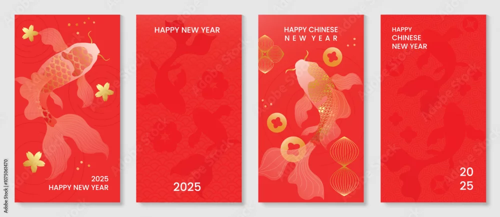 Chinese New Year 2025 greeting card background vector. Luxury poster design with koi fish, cherry blossom, pattern, line art. Elegant oriental illustration for cover, red envelope, calendar.