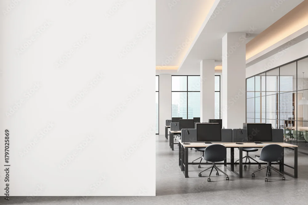 Empty white wall mockup in modern open space office with bright interior and computer desks, perfect for poster or banner design presentation template. 3D Rendering