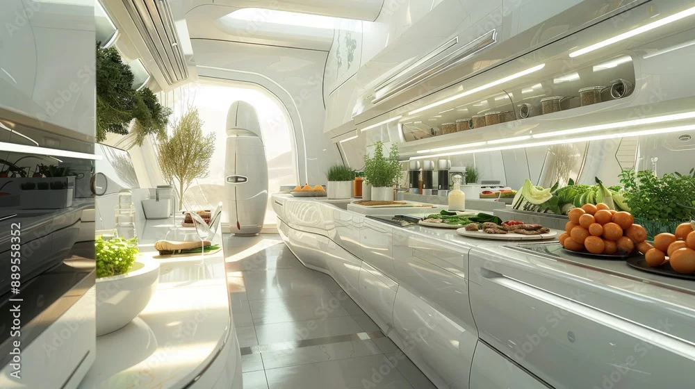 Fototapeta A futuristic kitchen with robotic chefs preparing gourmet meals and smart appliances managing food inventory