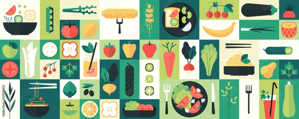 Fototapeta Abstract geometric organic vegetable food background. Fruits and vegetables, cold drinks, kitchen plants, noodles and salad, geometry farm eating, healthy lifestyle. Vector flat icons