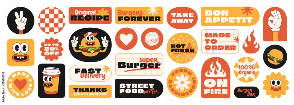 Burger retro cartoon fast food stickers. Comic character, slogan, quotes and other elements for burger bar, cafe, restaurant. Groovy funky vector illustration in trendy retro cartoon style.