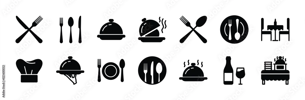 Catering icon set. Containing fork, spoon, knife, plate, cloche, tray, chef hat, beverage, food, dining table, and waiter. Cutlery or tableware in restaurant. Vector illustration