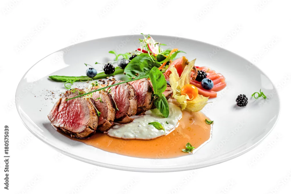 Delicious medium rare meat steak with sauce and salad on a plate. Healthy food made of meat fillet and fresh herbs isolated on a white background.